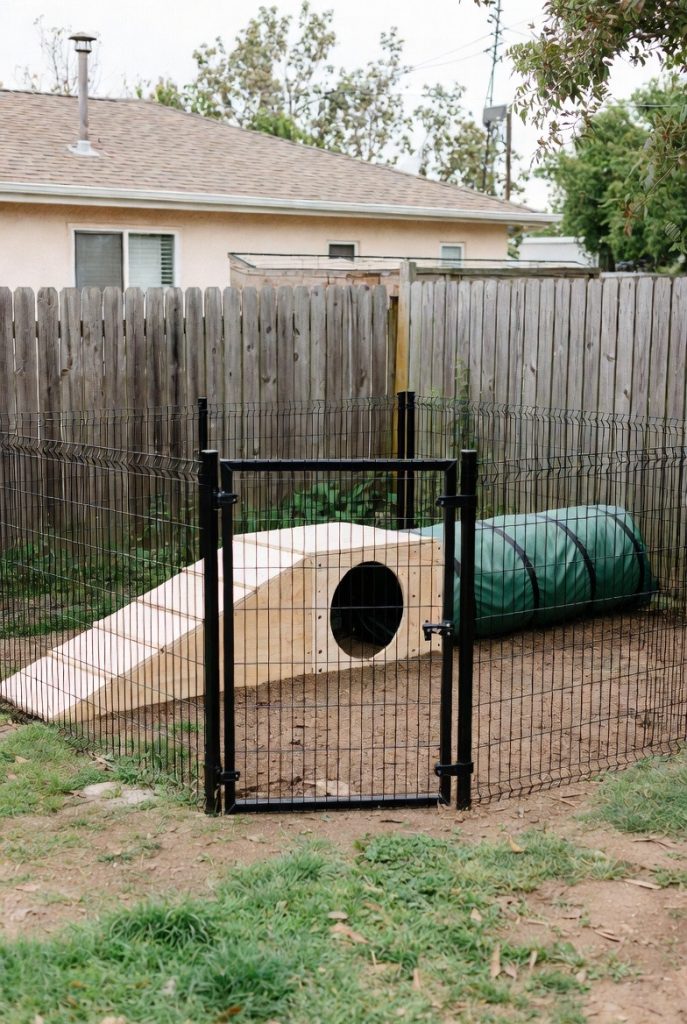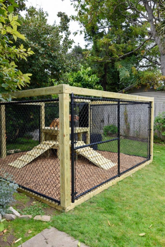 If you have a high-energy dog, a flat space might not be enough. This design incorporates low ramps, a small platform for ‘sentinel’ duty, and perhaps a tunnel. It encourages movement and exercise within a secure space. By utilizing verticality, you give your dog more ‘territory’ to explore without needing to increase the actual footprint of the pen in your yard.