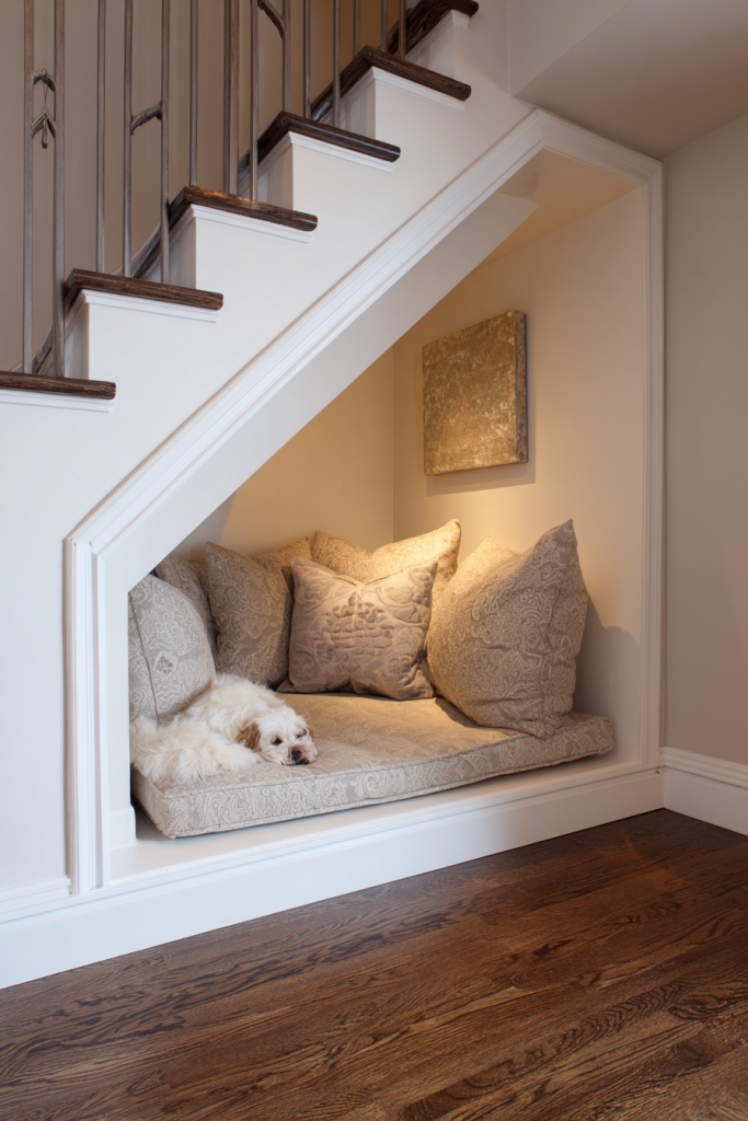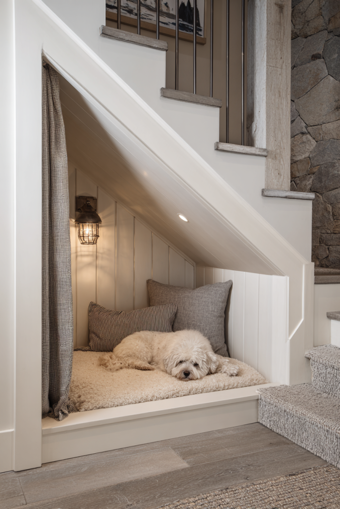 Dead space under a staircase is often the most underutilized real estate in a home, yet it makes for a perfect, cozy dog den. By opening up that wall and finishing the interior with soft lighting and a custom-fitted plush bed, you create a built-in sanctuary that takes up zero floor space in your main living area. It mimics the feeling of a natural cave, providing three solid walls of protection that many dogs find incredibly comforting during thunderstorms or fireworks. Adding a decorative gate or a stylish fabric curtain can turn it into a private suite for when you have guests over, ensuring your pet feels like they have a VIP room rather than being tucked away in a drafty hallway.