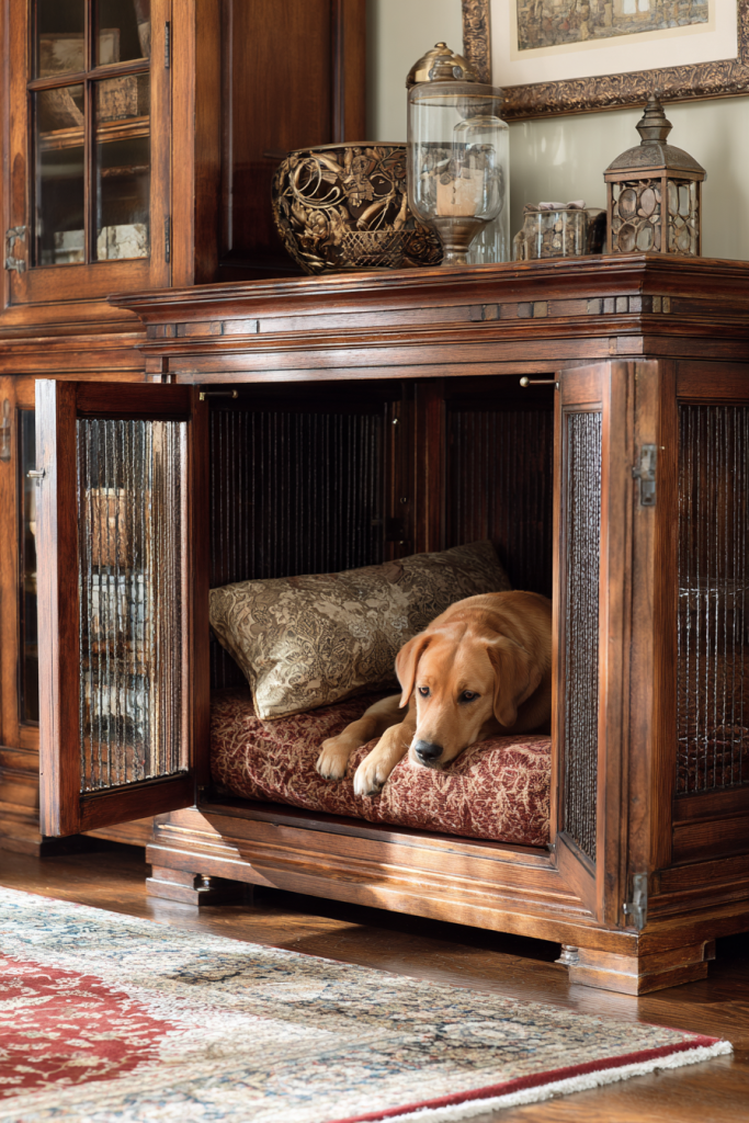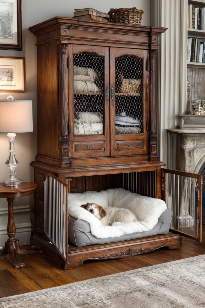 An old wooden armoire or a vintage cabinet can be easily transformed into a high-end pet suite with just a few thoughtful modifications. By removing the bottom doors and lining the interior with a durable, washable fabric, you create a furniture piece that looks like a beautiful antique but functions as a sophisticated dog house. The upper shelves can be used to store leashes, treats, and grooming supplies, keeping all of your pet essentials in one organized and aesthetic location. This approach is ideal for homeowners who want to maintain a classic interior design style while still providing a luxurious and private retreat for their furry companion, proving that pet ownership does not have to mean compromising on your personal home decor standards.