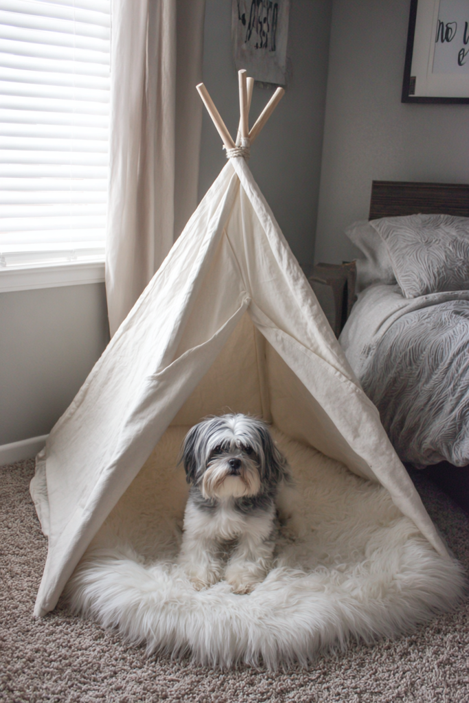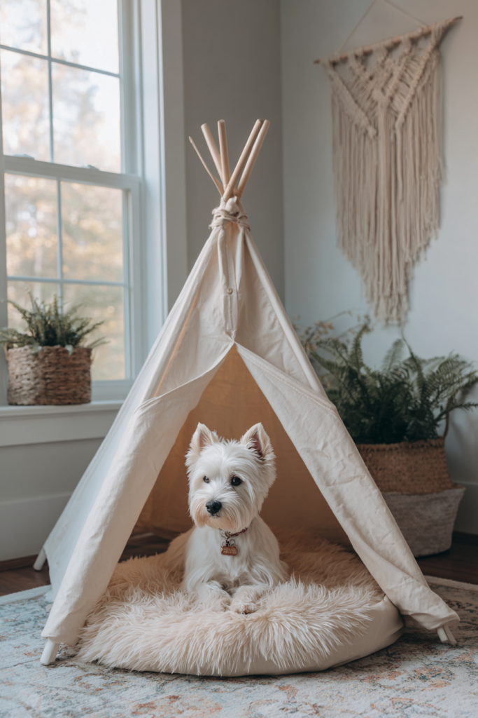 For a touch of bohemian flair that fits into almost any room, a fabric teepee is a delightful and non-permanent way to define a dog’s corner. These structures provide a soft, enclosed feeling that many smaller or medium-sized breeds find irresistible for afternoon naps. Because they are lightweight and easy to move, you can reposition the haven whenever you decide to rearrange your furniture. Choosing a canvas material in a neutral tone ensures that it blends seamlessly with your existing decor, while adding a faux-fur rug inside makes it the ultimate cozy destination. It turns a simple corner into a playful focal point that celebrates your dog’s personality while adding a layer of soft texture and visual interest to your living space.