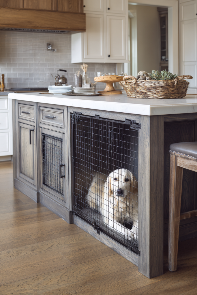 If your dog loves to be in the heart of the home while you are cooking, integrating a kennel into the end of your kitchen island is a brilliant use of space. By replacing a standard cabinet with a decorative wire or wooden mesh door, you give your dog a front-row seat to the kitchen action without them being underfoot. This design keeps the floor clear and allows the dog to feel included in the family’s daily rhythms while staying safe and secure. It is an excellent solution for high-traffic areas where a traditional crate might be a tripping hazard. This custom feature adds significant value to your home by showing a high level of intentionality and care for the needs of every family member, including the four-legged ones.