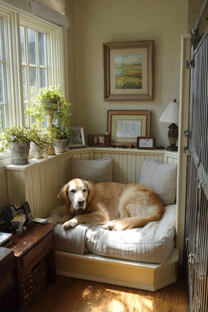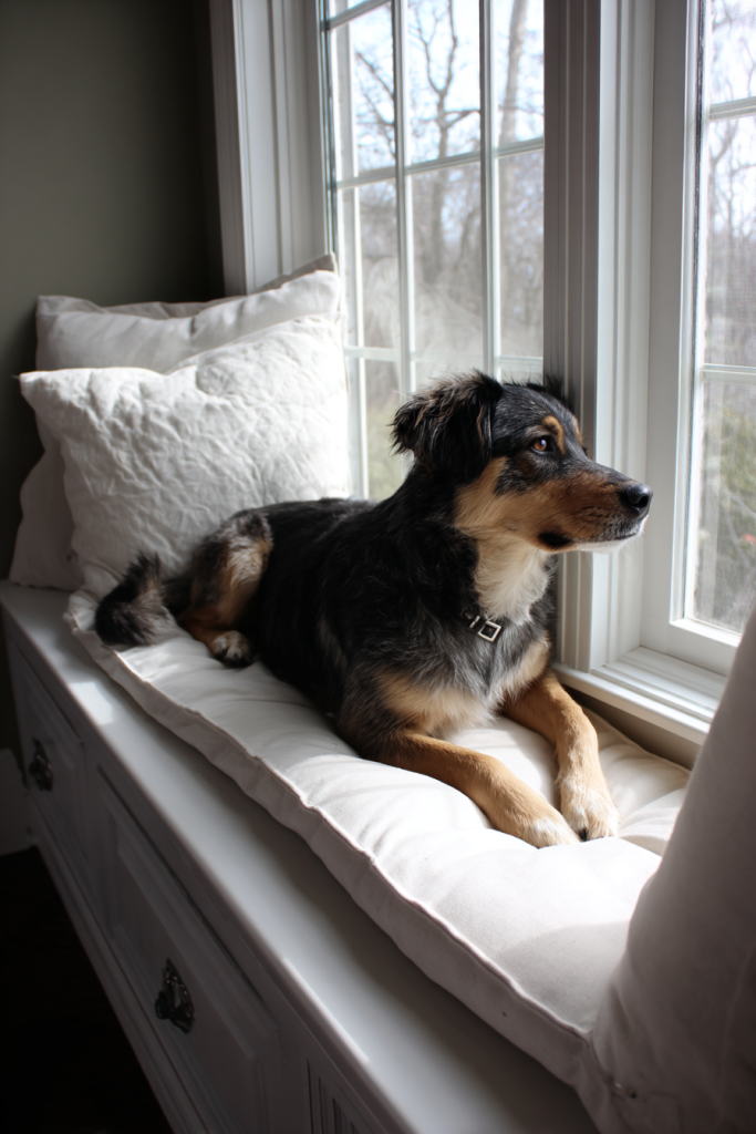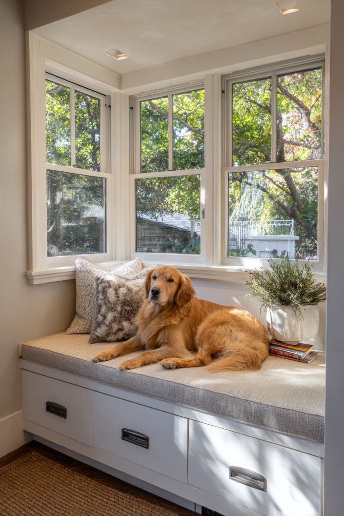 Many dogs are fascinated by the world outside, and a corner window bench allows them to indulge their curiosity in total comfort. By extending a windowsill into a wider padded bench, you create a perfect perch where your dog can watch for the mail carrier or track squirrels in the yard. You can use the space beneath the bench for integrated storage drawers to hold toys and blankets, keeping the corner tidy and functional. This setup provides your pet with plenty of natural light and mental stimulation throughout the day, which can be especially helpful for dogs who spend long hours indoors. It turns a simple window into a multi-functional piece of furniture that serves as a bed, a lookout point, and a storage unit all in one.