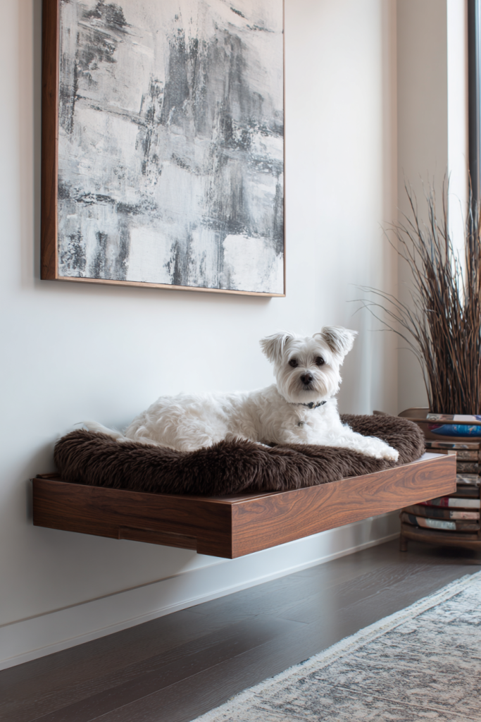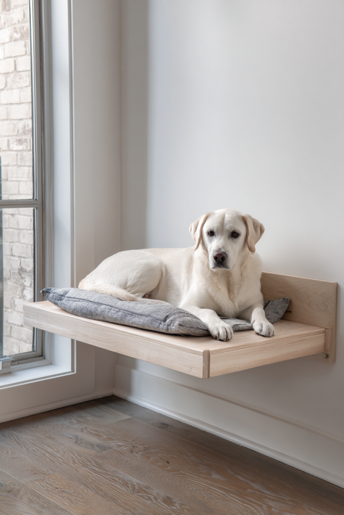 For the modern home that favors clean lines and open spaces, a floating dog bed attached to the wall offers a sleek and sophisticated look. By mounting a sturdy wooden platform a few inches off the floor, you create a designated spot that feels light and airy rather than bulky. This design makes it incredibly easy to vacuum or mop under the bed, ensuring that the dog’s corner remains hygienic and hair-free with minimal effort. You can paint the platform to match your baseboards or leave the natural wood grain exposed for a Scandinavian aesthetic. It is a subtle way to define your dog’s territory without cluttering the room, providing a firm and elevated sleeping surface that many older dogs find easier to access than a traditional floor pillow.