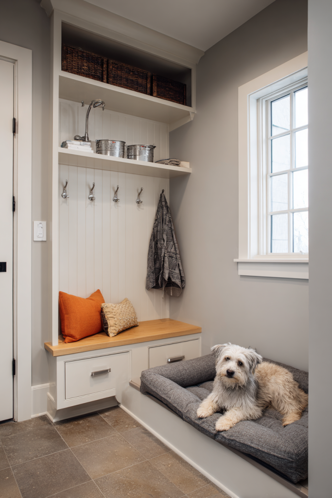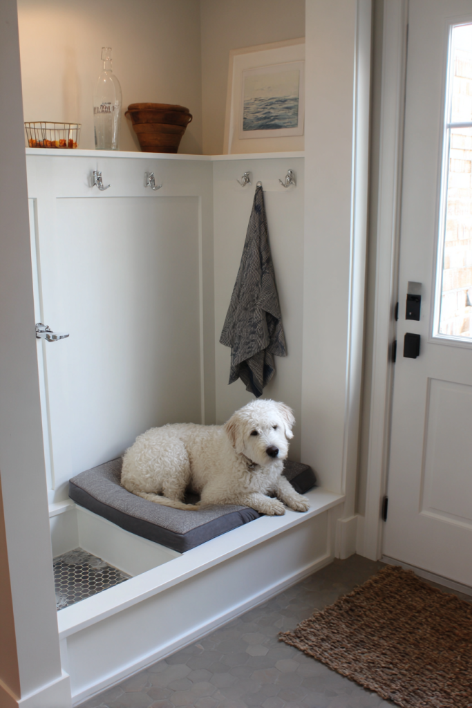 If you have a mudroom or a large entryway, converting one corner into a dedicated cleaning station and resting spot is a practical masterstroke. You can install a low-profile dog shower for rinsing off muddy paws and then place a quick-dry orthopedic bed in the adjacent corner. This setup ensures that the mess of a rainy walk stays contained in one area of the home, preventing dirt from being tracked onto your carpets or furniture. Adding a few hooks for damp towels and a small bin for dirty toys keeps the space organized and efficient. It transforms a utilitarian entry into a welcoming transition zone where your dog can be cleaned, dried, and rested before they ever step foot into the main living areas of the house.