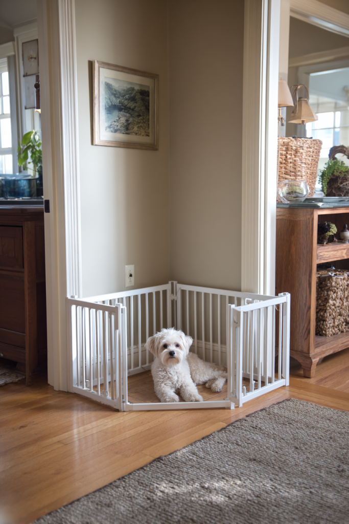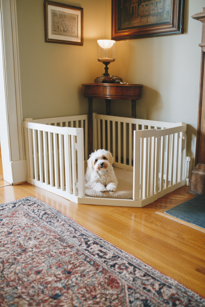 For those who want to create a clear physical boundary for their dog without using a metal crate, a small indoor picket fence can define a charming and open corner. This low-profile barrier allows the dog to see everything happening in the room while clearly marking the space as theirs. It is a fantastic option for puppies who are still learning the rules of the house or for senior dogs who need a quiet spot away from the energy of children or other pets. You can customize the height and color of the fence to match your room’s trim, making it look like an intentional architectural detail. It provides a sense of security and structure without making the dog feel isolated or trapped behind solid walls.