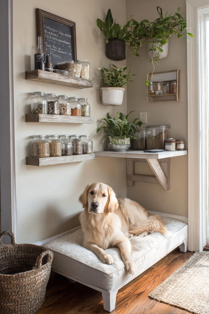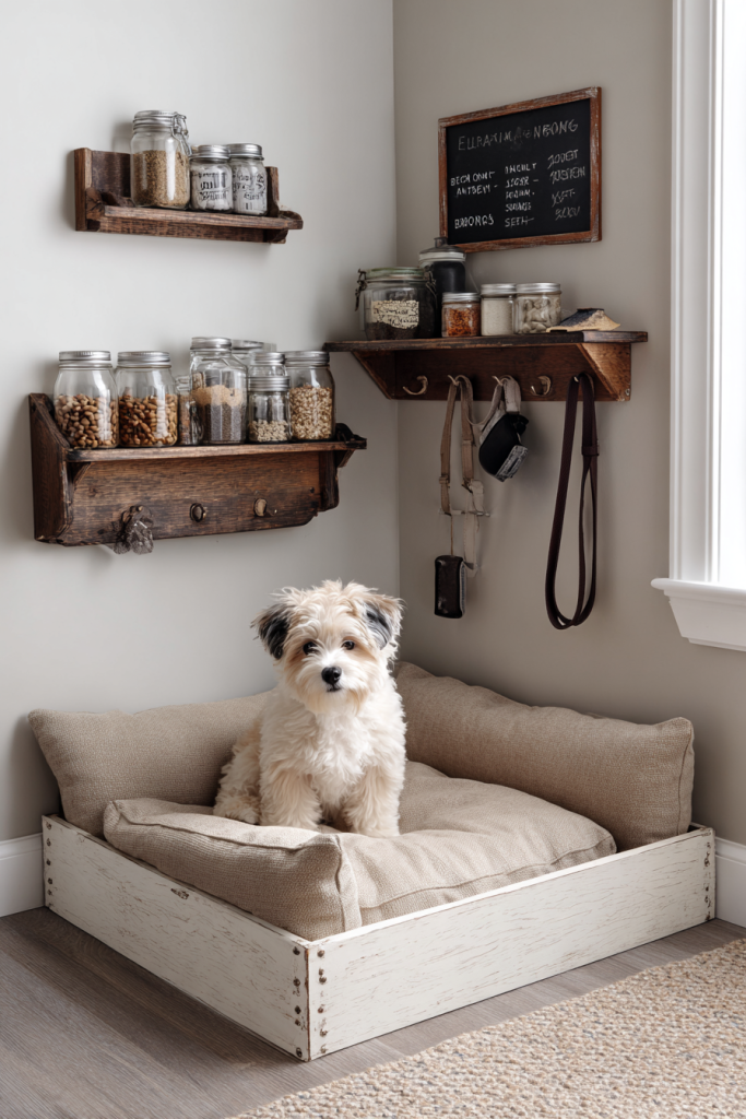 A dog corner is not just about the bed; it is about the organization of their entire life, and a wall-mounted station can keep everything in its place. By installing a series of decorative hooks, a small chalkboard for feeding schedules, and a shelf for apothecary jars filled with treats, you turn a blank wall into a functional command center. This prevents the cluttered look of leashes draped over chairs or treat bags sitting on the counter. You can place the dog’s bed directly underneath this station to tie the whole corner together visually. It creates a centralized hub for all pet-related activities, making it easier for every family member to stay on top of the dog’s care while keeping the rest of your home feeling tidy and intentional.