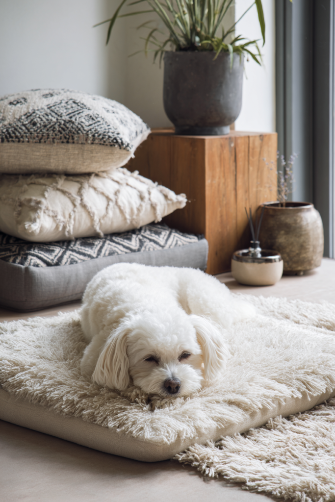 For the dog that needs a little extra help relaxing, a sensory corner filled with calming textures and scents can be a game-changer. You can use a thick, shag-pile rug to provide a variety of tactile sensations and place a pet-safe diffuser nearby with a hint of lavender to promote relaxation. Including a few different types of pillows, such as a bolster bed and a flat mat, allows your dog to choose the sleeping position that best suits their mood. Adding a small, indoor-safe water fountain provides a gentle auditory backdrop that can help mask the sound of outside traffic or loud neighbors. This holistic approach to pet design prioritizes your dog’s emotional well-being, turning their corner into a true spa-like retreat that supports their mental health and tranquility.
