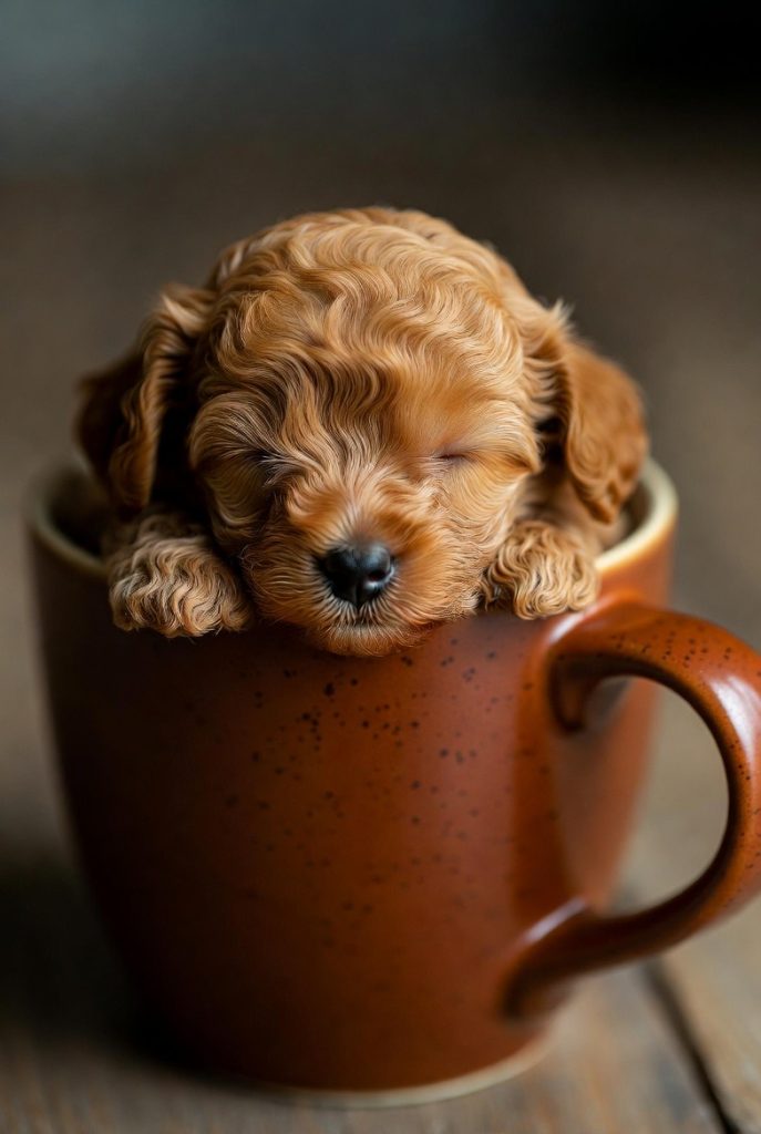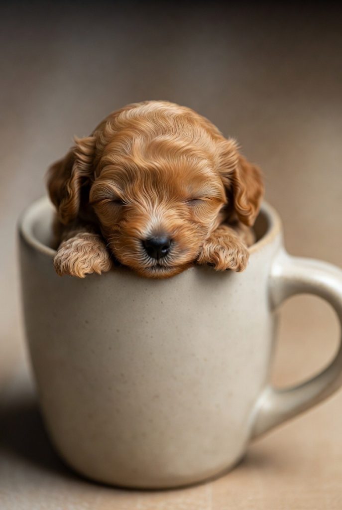 Scale is everything when it comes to cuteness, and a Teacup Poodle puppy is impossibly small. Seeing a tiny, curly-haired pup tucked into a ceramic coffee mug for a nap is almost too much for the brain to handle. They look like a little puff of steam caught in a cup, with only their black button nose and one ear peeking out. This image highlights just how delicate and precious they are in those first few weeks, and it makes you want to protect and cherish every small thing in life.