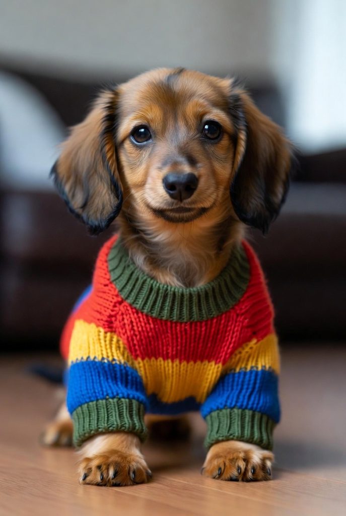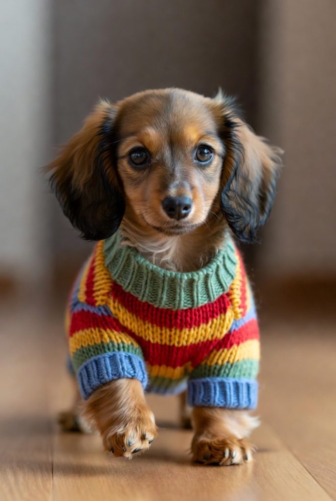 Dachshunds are famously long and low, which makes finding clothes for them a bit of a challenge. Putting a tiny, knitted sweater on a “wiener dog” puppy is a guaranteed comedy show. Because their legs are so short, they often trip over the sleeves or end up waddling like a tiny, colorful penguin. Despite the struggle, they look incredibly cozy and ready for a nap. It is a perfect blend of awkwardness and absolute style that captures their spunky, brave personality.