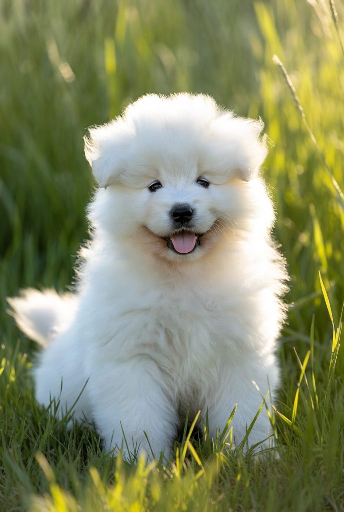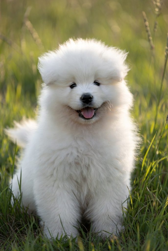 The Samoyed is often called the smiling dog because the corners of their mouths naturally turn up. These pups look like they were made out of cotton candy and sunshine. Seeing a white, fluffy Samoyed pup sitting in a field of green grass is pure aesthetic bliss. They are incredibly social and friendly, often running up to anyone they see with a wagging tail and that signature grin. Their happiness is genuinely radiant, acting as a natural remedy for a gloomy afternoon.