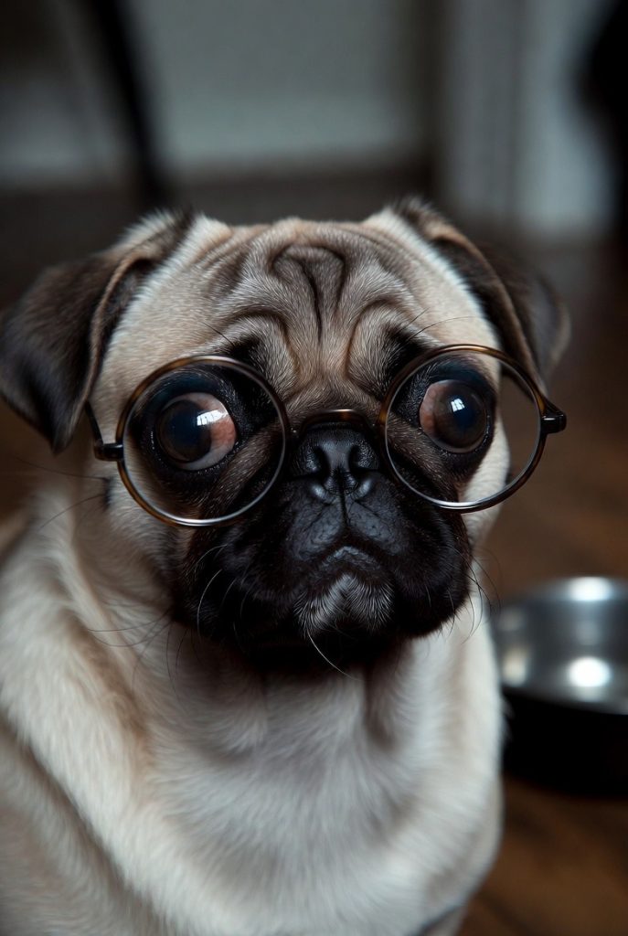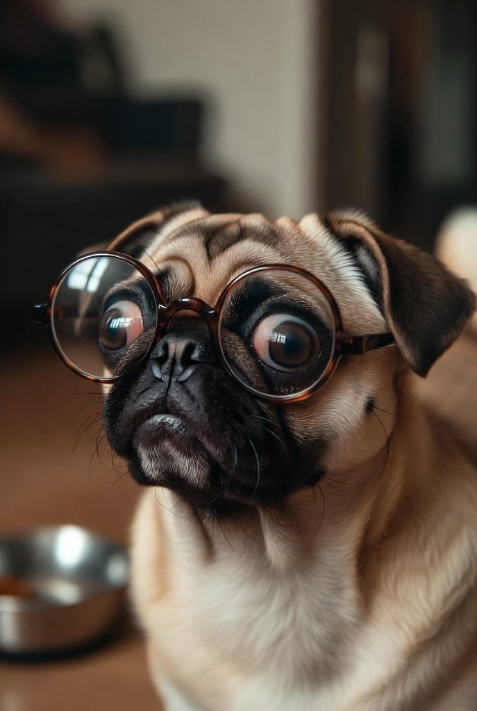 Pugs have faces that are already full of character, and a pair of round, vintage-style glasses only emphasizes their soulful, wrinkled brows. In these frames, a Pug looks like a Victorian poet who is currently suffering from a very dramatic bout of writer’s block. The way their eyes bulge slightly behind the glass adds a layer of comical intensity to their expression. It is a look that says, ‘I have seen the depths of the empty food bowl, and I have found it wanting.’ They manage to look both incredibly dignified and hilariously overwhelmed all at once.