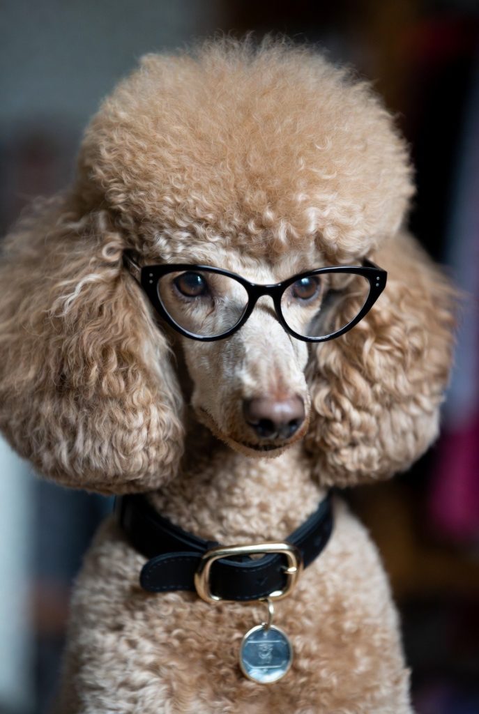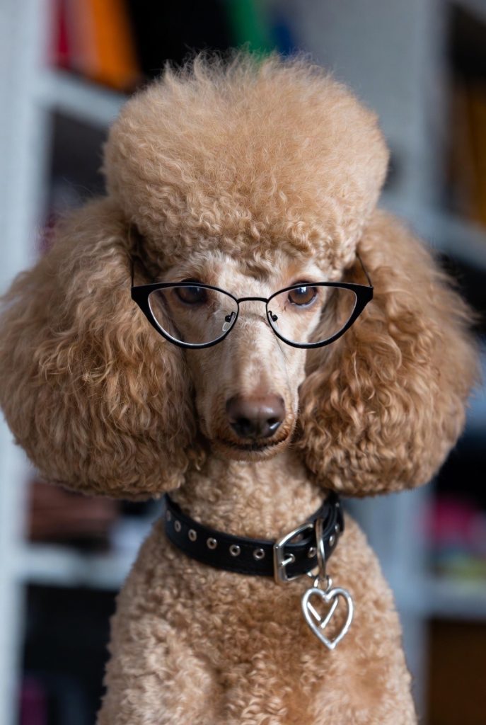 Poodles carry themselves with an innate elegance, and in a pair of sharp cat-eye glasses, they look like the formidable editor of a high-end fashion magazine. Their curly top-knots provide the perfect height to balance out bold frames, and their long, slender snouts carry the eyewear with ease. This look is all about sophistication and a hint of ‘I know better than you.’ Whether they are a standard or a toy poodle, the glasses add a layer of refinement that makes it seem like they are just one step away from speaking fluent French and critiquing your choice of footwear.