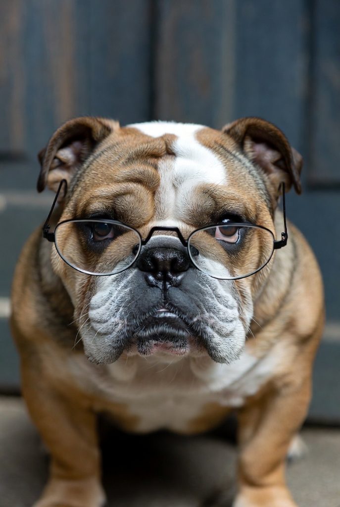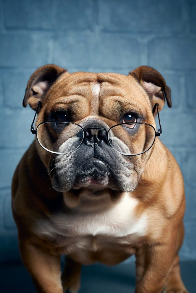 The English Bulldog has a naturally grumpy, stoic face that is perfectly suited for half-moon spectacles perched low on the nose. In this gear, they look like a retired judge or a grumpy history teacher who is just about done with your excuses for missing homework. Their jowls and wide stance give them an air of authority that the glasses only enhance. It is a ruggedly intellectual look that captures the breed’s charm, they might look tough and serious, but you know that underneath the glasses is a dog that would happily trade all their wisdom for a good belly rub.