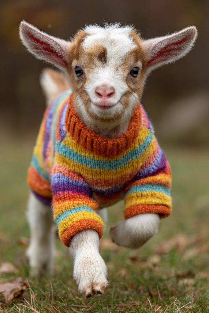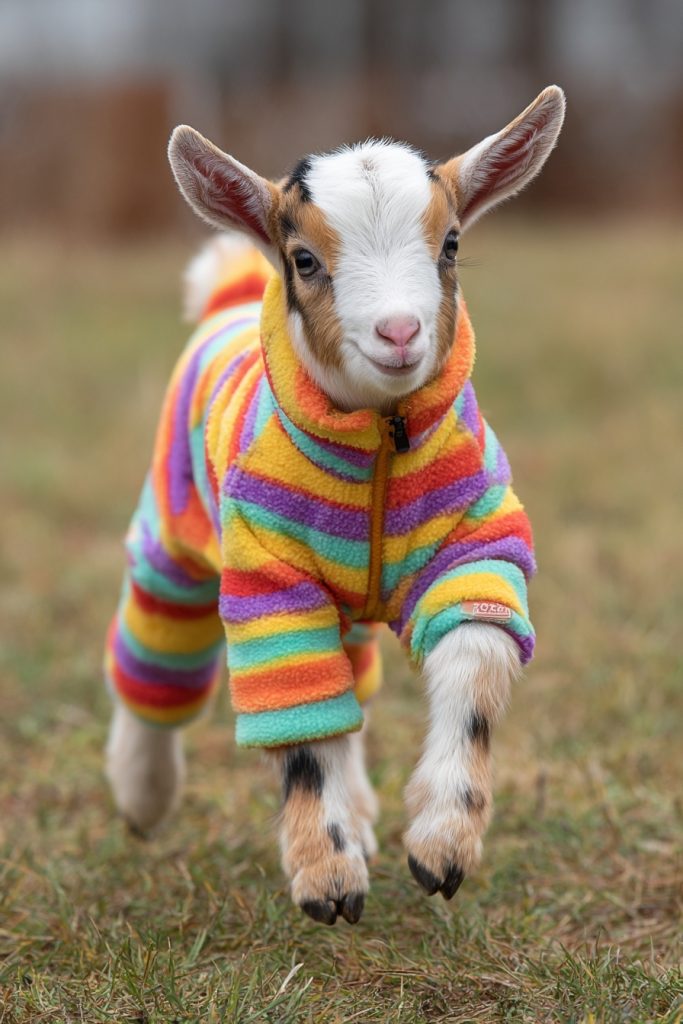 In recent years, it has become a popular and practical trend to dress baby goats in colorful sweaters or custom-made pajamas to keep them warm during chilly nights. While the sight of a kid in a fleece onesie is undeniably cute, it also serves a functional purpose by helping them regulate their body temperature while their coats are still developing. The result is a whimsical display of personality, as each goat seems to take on a new character once they are outfitted in their vibrant gear. These photos capture a unique blend of domestic care and wild spirit, showing how much people enjoy nurturing these spirited animals. A group of kids running through a field in matching striped pajamas is a visual feast of color and movement that represents the playful intersection of human creativity and animal charm.