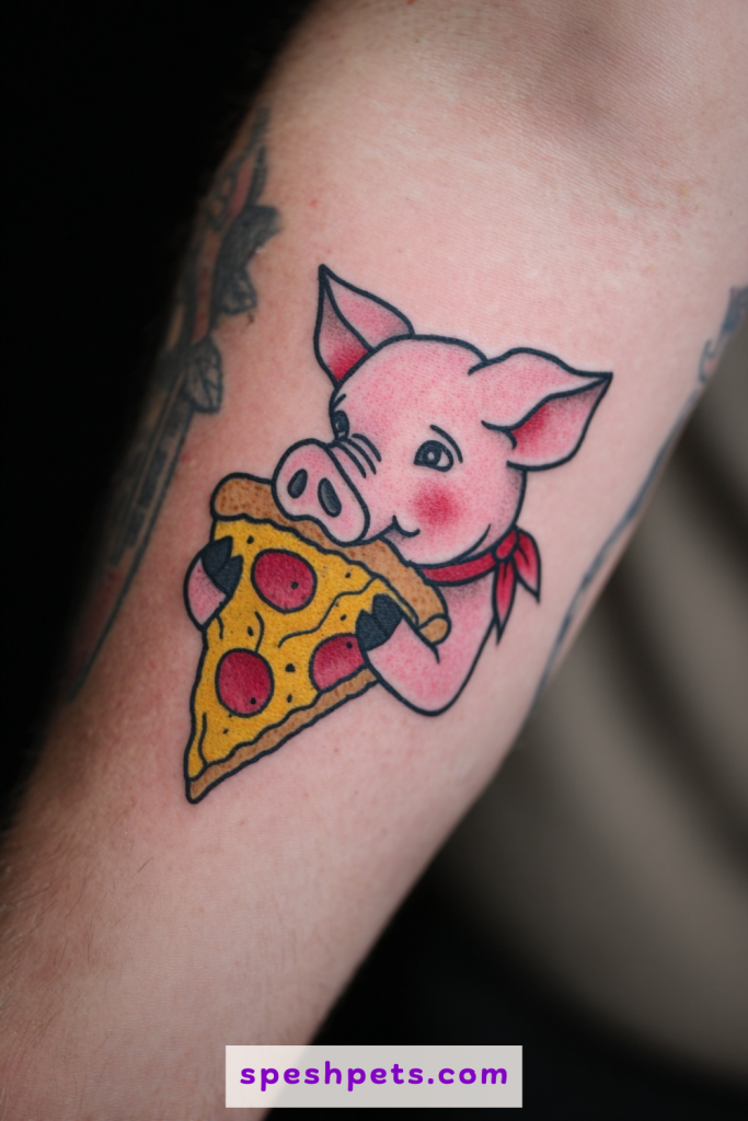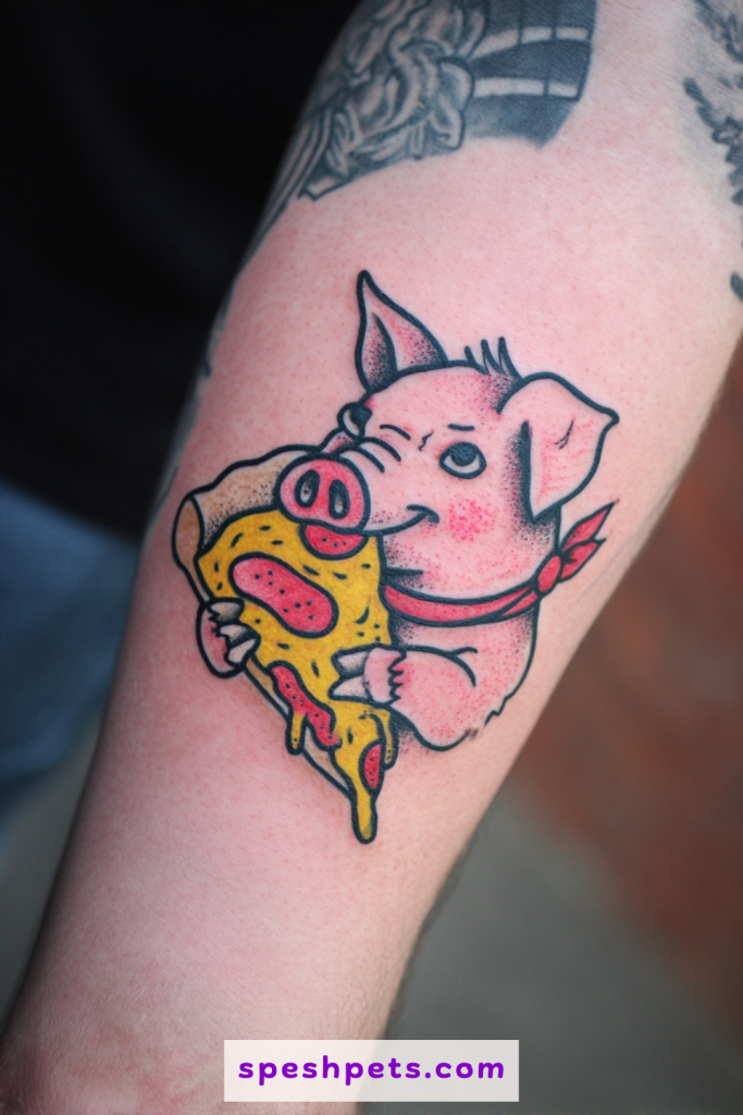 There is something inherently classic about a bold, traditional-style tattoo featuring a pig mid-bite into a gooey slice of pepperoni pizza. This design relies on thick black outlines and a vibrant, limited color palette to make the imagery pop against the skin. You could have the pig wearing a tiny red neckerchief to give it an old-school Italian chef vibe, adding layers of personality to the piece. The contrast between the soft pink of the pig and the bright yellows and reds of the pizza creates a visually striking balance. It is a perfect choice for those who appreciate the heritage of tattooing while wanting to express a modern and humorous love for the ultimate comfort food.