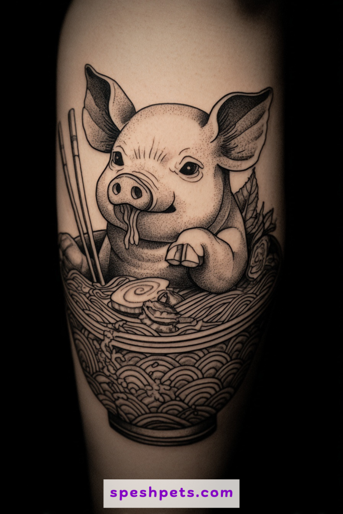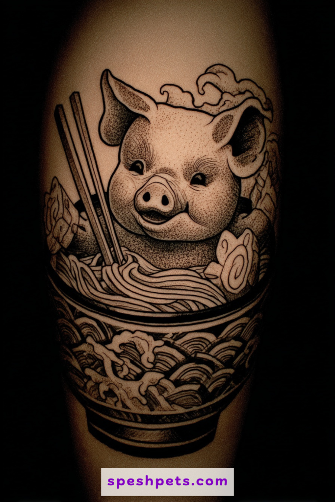 Combining the adorable features of a pig with the intricate aesthetics of Japanese irezumi can result in a truly sophisticated piece of art. Imagine a chubby pig happily submerged in a giant, ornate ramen bowl, with its hooves clutching oversized chopsticks and a strand of noodle hanging from its mouth. You can incorporate traditional elements like stylized waves made of broth or narutomaki fish cakes to add authenticity to the design. This style allows for incredible detail in the ceramic patterns of the bowl and the textures of the ingredients. It is a culturally fused masterpiece that celebrates the warmth of a hot meal and the endearing nature of the animal in one cohesive image.