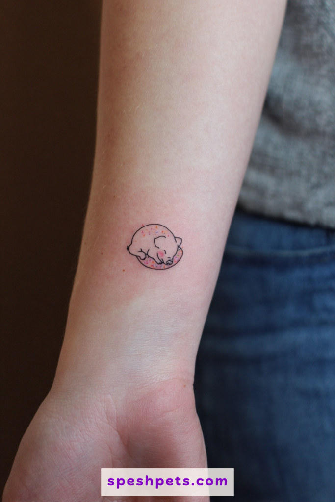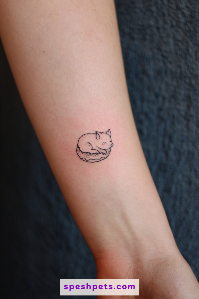 For those who prefer a more subtle approach to their ink, a minimalist fineline tattoo of a tiny piglet curled up inside the center of a donut is an incredibly sweet option. This design focuses on clean, delicate lines and perhaps a single pop of color for the frosting or sprinkles to draw the eye. The simplicity of the composition allows the cuteness of the piglet to shine through without overwhelming the senses. It works beautifully on smaller areas like the inner wrist or the ankle, serving as a tiny, private joke or a symbol of one’s sweet tooth. The lack of heavy shading ensures that the tattoo remains airy and modern, fitting perfectly with a contemporary aesthetic.