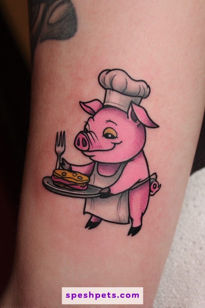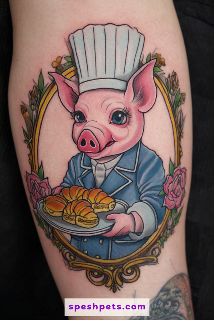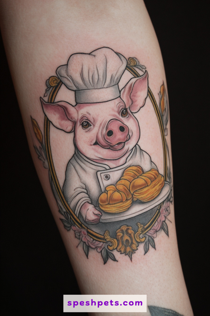 A neo-traditional tattoo allows for more depth, varied line weights, and a broader color spectrum, making it ideal for a detailed pig chef character. Picture a dignified hog wearing a tall white toque and a double-breasted jacket, proudly presenting a tray of golden-brown croissants or a decadent tiered cake. This design can incorporate decorative floral frames or kitchen utensils like whisks and rolling pins to round out the composition. The expressive eyes of the pig can convey a sense of professional pride and culinary passion, making it a wonderful tribute for actual chefs or dedicated home bakers. It is a rich, illustrative style that turns a fun concept into a high-end piece of body art.