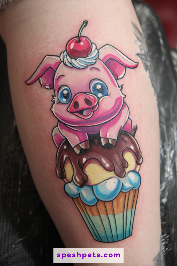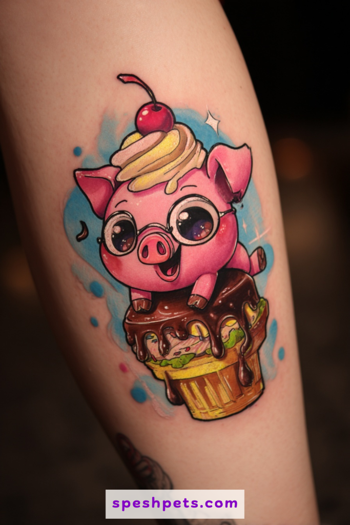 New school tattooing is known for its exaggerated proportions, bright neon colors, and cartoon-like energy, which fits the pigging out theme perfectly. Imagine a pig with massive, sparkling eyes sitting atop a towering sundae, covered in hot fudge and topped with a cherry. The warped perspective and vibrant shading make the design feel like it is jumping off the skin with excitement. You can play with textures like melting ice cream and fluffy whipped cream to create a tactile visual experience. This style is all about high energy and fun, making it the ultimate choice for someone who wants a tattoo that is as loud and joyful as their favorite dessert.