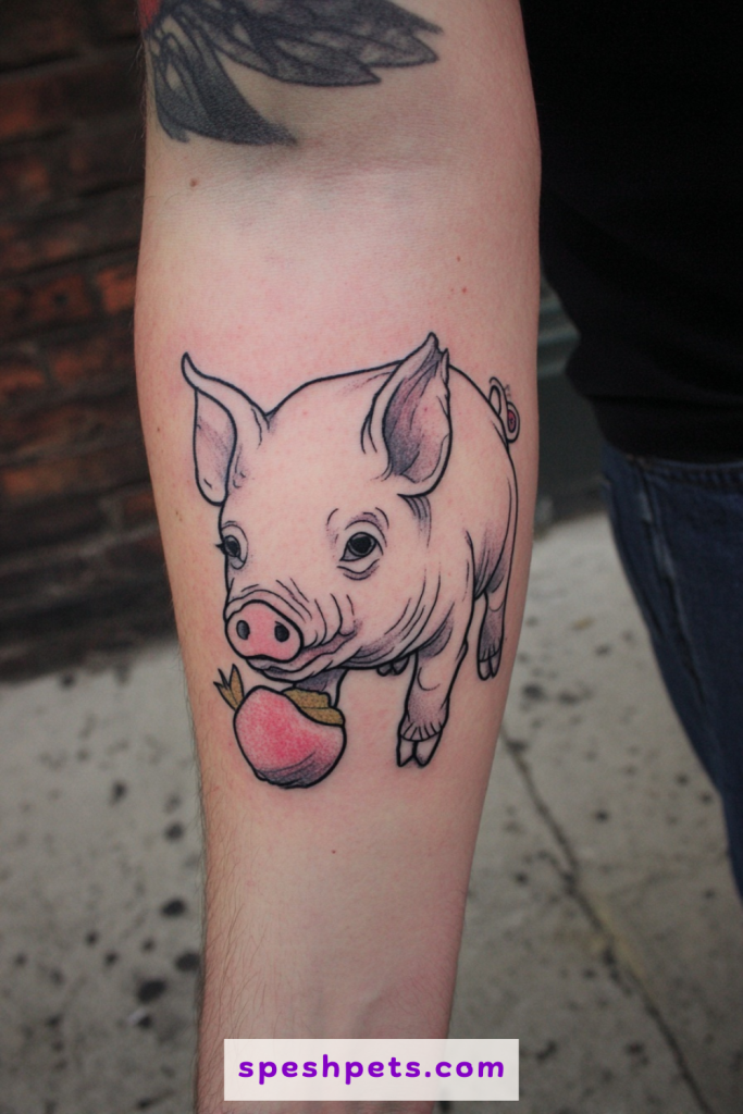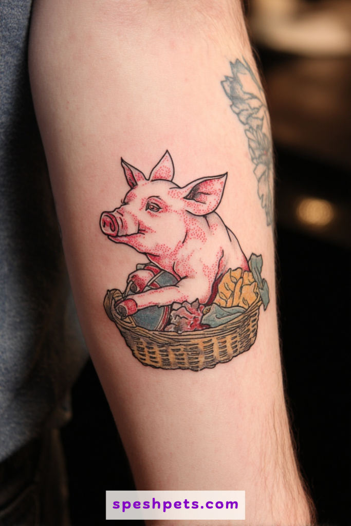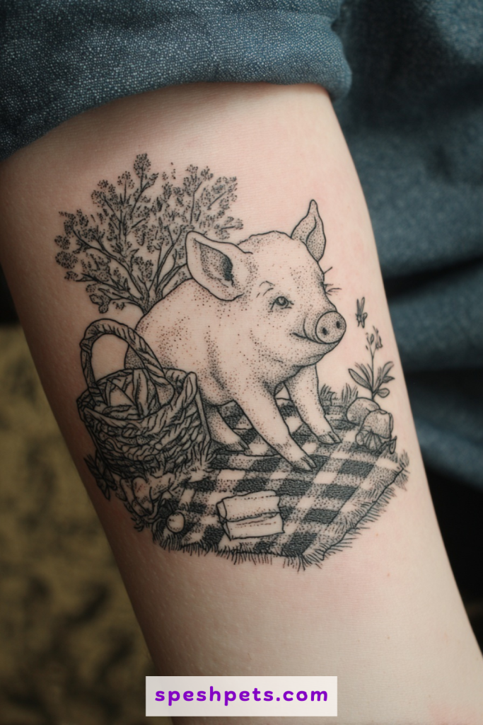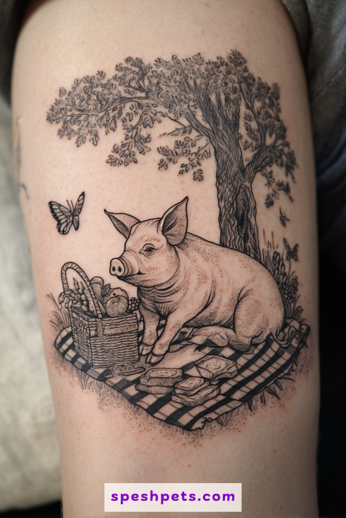 An illustrative tattoo can capture a more storybook-like quality, depicting a pig enjoying a full picnic spread under a shady tree. This design might include a checkered blanket, a basket spilling over with fruits, and a half-eaten sandwich in the pig’s trotters. By using cross-hatching and soft stippling for shading, the artist can create a sense of nostalgia and warmth, as if the image were pulled straight from a classic children’s novel. This more elaborate scene allows for a lot of hidden details, like a stray ant heading for the crumbs or a butterfly landing on the pig’s ear, making it a piece that people will want to study closely.