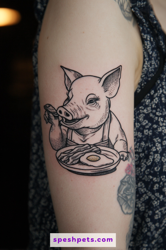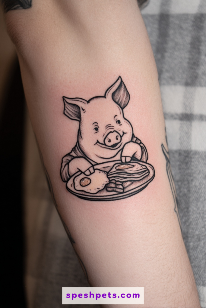 For those with a darker or more self-aware sense of humor, a tattoo of a pig blissfully eating a plate of eggs and bacon is a classic choice in the world of ironic ink. This design plays on the absurdity of the situation, often depicted in a clean, graphic style to emphasize the punchline. The pig should look completely content and oblivious, perhaps with a little napkin tucked into its collar. This type of tattoo is a great conversation starter and shows that the wearer has a robust sense of irony and doesn’t mind a bit of controversy. It is a bold statement piece that prioritizes wit and humor above traditional sentimentality.