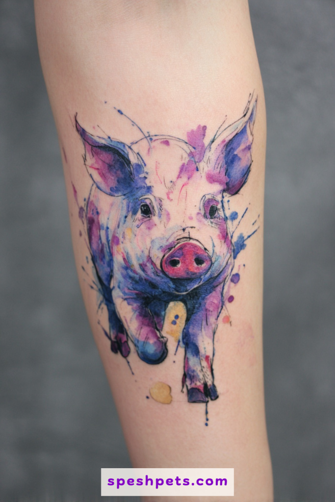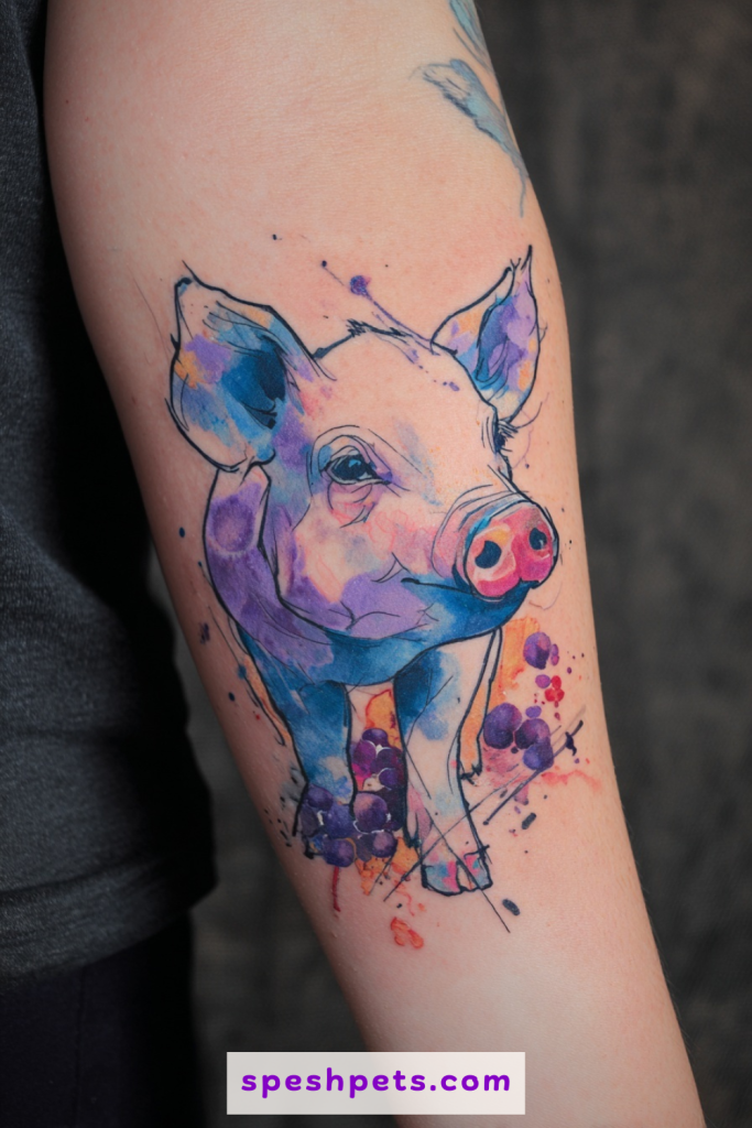 The watercolor style is perfect for capturing the messy, vibrant joy of a pig foraging through a patch of wild berries. Instead of strict outlines, this tattoo uses splashes of purple, blue, and red ink to represent juice stains on the pig’s snout and hooves. The fluid nature of the watercolor technique mimics the unpredictability of nature and the unbridled enthusiasm of the animal. It is a soft, artistic approach that feels more like a painting than a traditional tattoo, making it a beautiful choice for someone who wants their ink to have a more ethereal and organic feel. The bright bursts of berry color provide a beautiful contrast against the softer, washed-out tones of the pig’s skin.