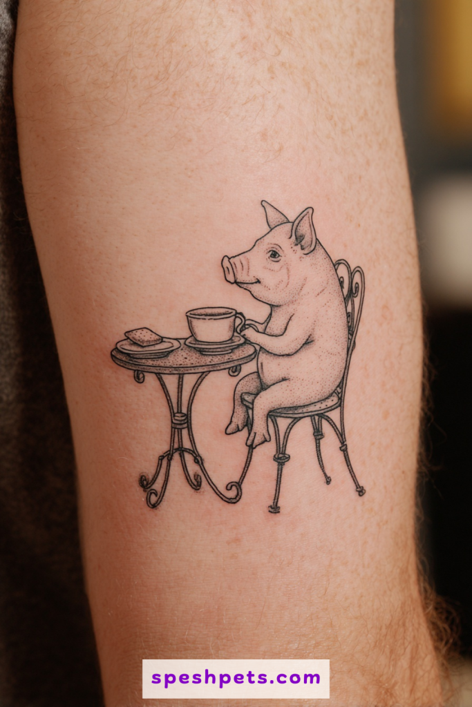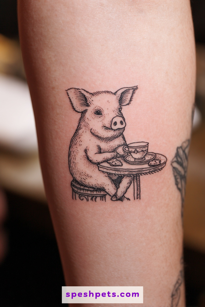 Not all pigging out needs to be messy; sometimes it can be a refined affair. A tattoo of a pig sitting upright at a tiny wrought-iron table, sipping tea from a delicate porcelain cup and nibbling on a biscuit, is a charming and unexpected idea. This design can be done in an etching or woodcut style to give it an antique, Victorian-era feel. It celebrates the ritual of the afternoon snack and the idea that even a pig can appreciate the finer things in life. This whimsical juxtaposition of a farm animal with high-society manners is both endearing and visually interesting, offering a sophisticated take on the gluttony theme.