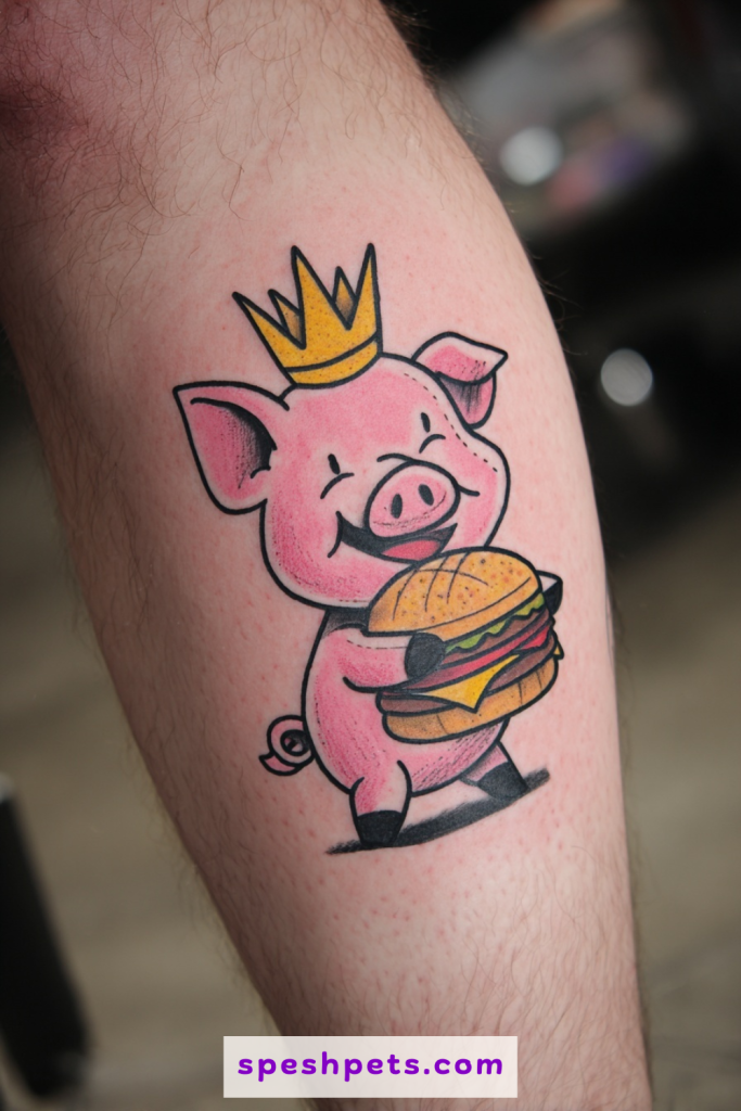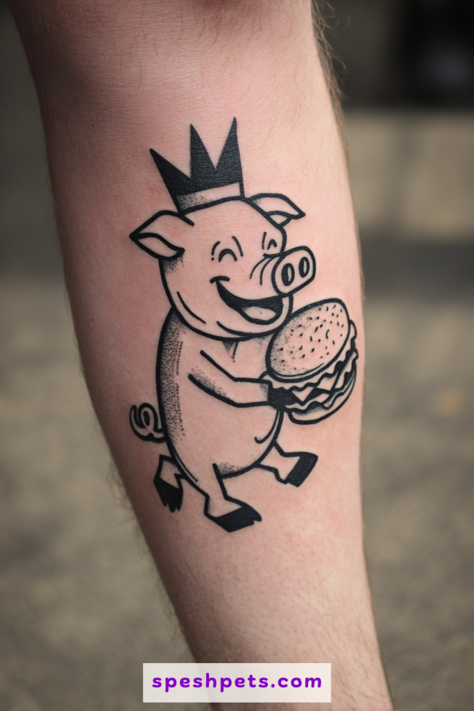 A large-scale, graphic tattoo of a pig wearing a crown and triumphantly holding a massive cheeseburger is a fantastic way to claim your title as a food lover. This design works well with solid blocks of color and sharp, clean edges that give it a modern, almost logo-like appearance. The crown adds a layer of triumph to the act of eating, suggesting that the pig is the monarch of the grill. It is a high-impact design that looks great on larger canvases like the thigh or the upper arm. The simplicity of the graphic elements ensures that the tattoo remains legible from a distance, making a clear and proud statement about the wearer’s priorities.